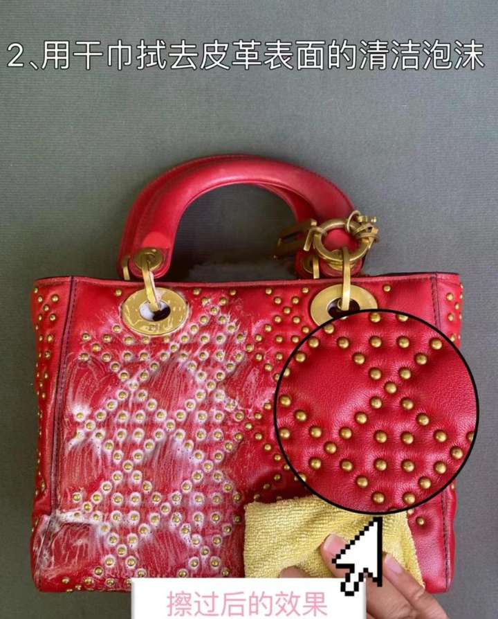我先喷上配套的清洁剂,再用配套的马毛刷按照说明打圈擦拭了皮具表面的灰尘和污渍,这个刷子真的特别柔软,不会伤到皮子,但是可以去掉藏在小缝隙里面的污渍。