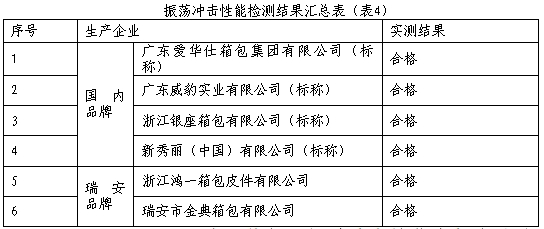 QB/T 2155-2018《旅行箱包》振荡冲击性能中规定试验后箱体(包体)不变形,无开裂;各部件不变形,无断裂、损坏,不开线;固定件、连接件不松动;拉杆拉合顺畅,不变形、不松动、无卡阻,不脱节;拉杆与箱体(包体)结合部无开裂、松动;箱(包)锁开启正常,密码锁无卡死、跳号、脱勾、乱号及密码失控beat365平台现象。从表中可知,瑞安市本地生产企业2批次与瑞安市外国内知名品牌箱包4批次振荡冲击性能均合格,合格率为100%。