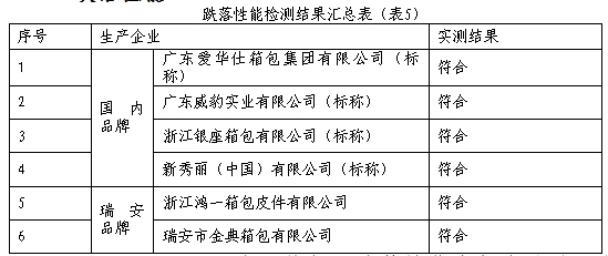 QB/T 2155-2018《旅行箱包》跌落性能中规定试验后箱体、箱口、衬架不开裂,可有凹陷;走轮、轮轴、支架不断裂;对口箱底、盖口缝间隙不大于2mm,掩口箱合缝间隙不大于3mm;走轮转动灵活,无松脱;固定件、连接件、锁不变形、不松动、无损坏;箱(包)锁开启灵活;箱(包)面无裂纹。此次质量比对6个批次的产品跌落性能均合格。
