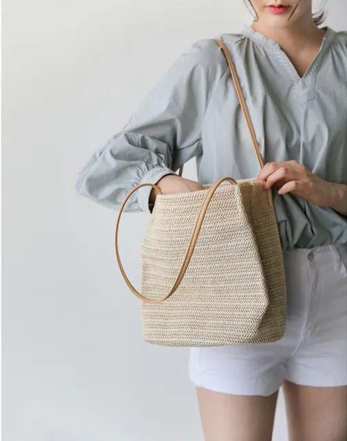 当然这里面也有一些小技巧,比如时装感的衣裙,可以用小而美的手拎草编包、休闲感的衣裙,可以用大一点的单肩背草编包。