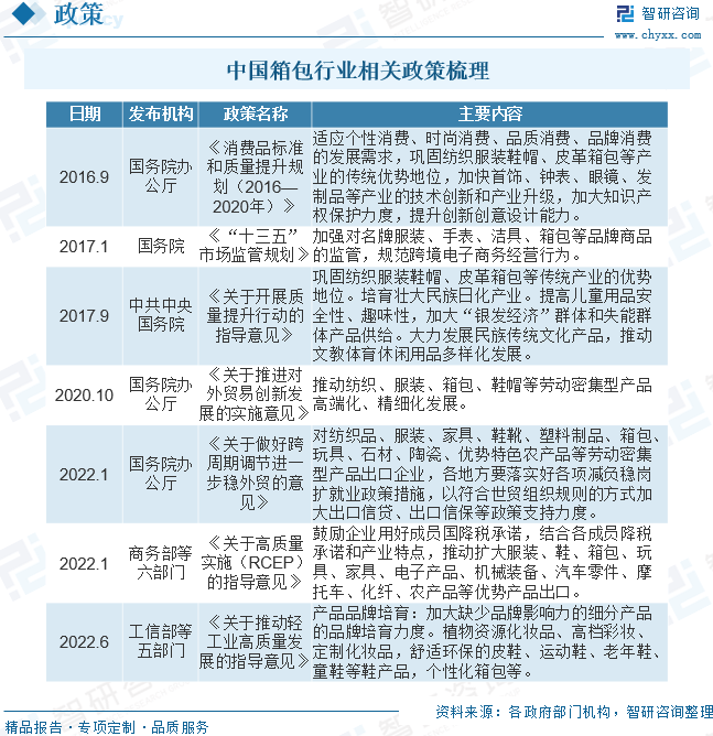 目前,箱包行业是我国重点鼓励、扶持发展的产业。我国政府通过制定产业政策和颁布法律法规,从税收减免、投资优惠、研发支持、人才培养到知识产权保护等方面,对企业所处行业给予大力扶持。近年来我国箱包行业主要政策如下: