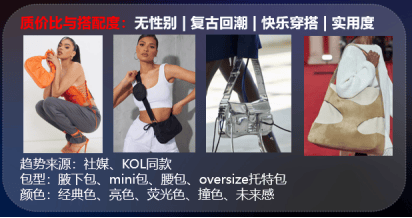 在风格方面,偏好Y2K辣妹风、中性风、极简风、运动风以及老花、亮色穿搭。这些需求也反应到类目趋势上,从增长率和趋势波动性来看,箱包重点发展产品线:Tote包、hobo腋下包、马鞍包、翻盖包、腰包、水桶包,一直是需求较为稳定的包型;同时运动风的健身包和背包,以及旅行袋、化妆包新品热度非常高,正迎合了后疫情时代人们的运动健身和出行需求。