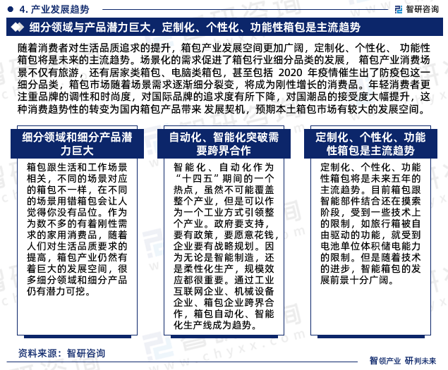 随着消费者对生活品质追求的提升,箱包产业发展空间更加广阔,定制化、个性化、 功能性箱包将是未来的主流趋势。