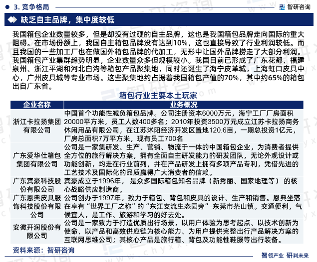 我国箱包企业数量较多,但是却没有过硬的自主品牌,这也是我国箱包品牌走向国际的重大阻碍。在市场份额上,我国自主箱包品牌没有达到10%,这也直接导致了行业利润较低。而且我国的一些加工厂也在做国外箱包品牌的代加工,无形中让国外品牌捞走了大部分利润。