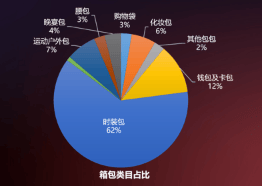 从箱包主要二级类目的销售占比来看,箱包作为第二大品类,年增长率超过60%,而时尚包占比达到62%,钱包占比12%。今年需要关注的一个趋势是,运动户外包、腰包、化妆包占比显著提升,尤其是运动户外包占比跃升至7%,说明在追求时尚之余,功能包的需求量日益攀升。