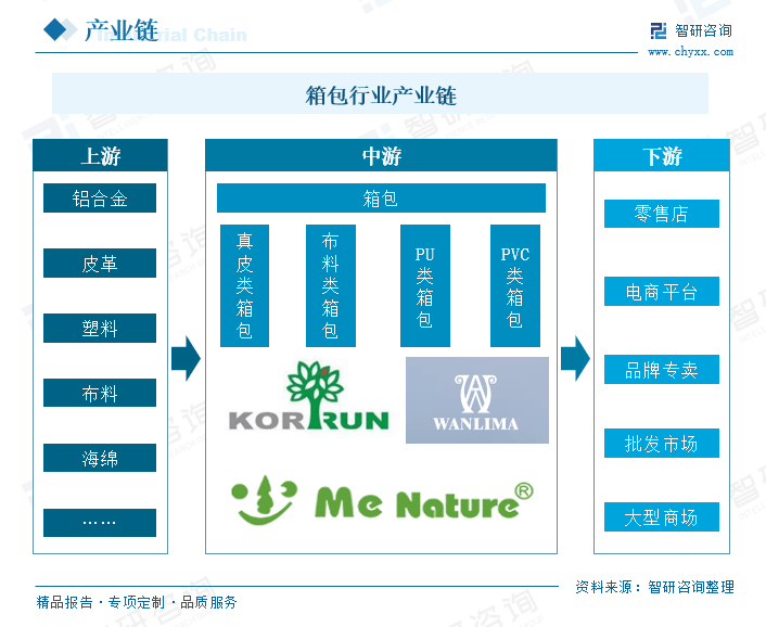 箱包行业的产业链上游原材料主要有铝合金、皮革、塑料、布料、海绵等等;中游是箱包的生产商,箱包按照生产材质大致可以分为真皮类箱包、布料类箱包、PU类箱包、PVC类箱包,代表性企业有开润股份、浙江自然、万力马等;下游的营销渠道可以分为线上和线下,线下销售渠道包括零售店、品牌专卖店、批发市场、大型商场,线上销售渠道主要为电商平台,包括天猫、淘宝、京东等等。