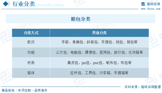 箱包是对袋子的统称,是用来装东西的各种包包的统称,包括一般的购物袋、手提包、手拿包、钱包、背包、单肩包、挎包、腰包和多种拉杆箱等。按款式来分,箱包可分为手袋、单肩包、斜背包、手提包、钱包、背包等;按功能来分。可分为公文包、电脑包、摄像包、医用包、旅行包、化妆箱等;按材质来分,可分为真皮包、pu包、pvc包、帆布包、布包等;按箱体来分,可分beat365平台为拉杆包、工具包、行李箱、手提箱等。