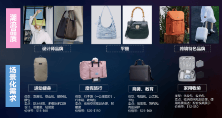 主要包含时尚包、钱包,针对的是Z世代等以买潮流为需求点的人群,他们关注的是时尚度、搭配性、上新速度和产品品质。