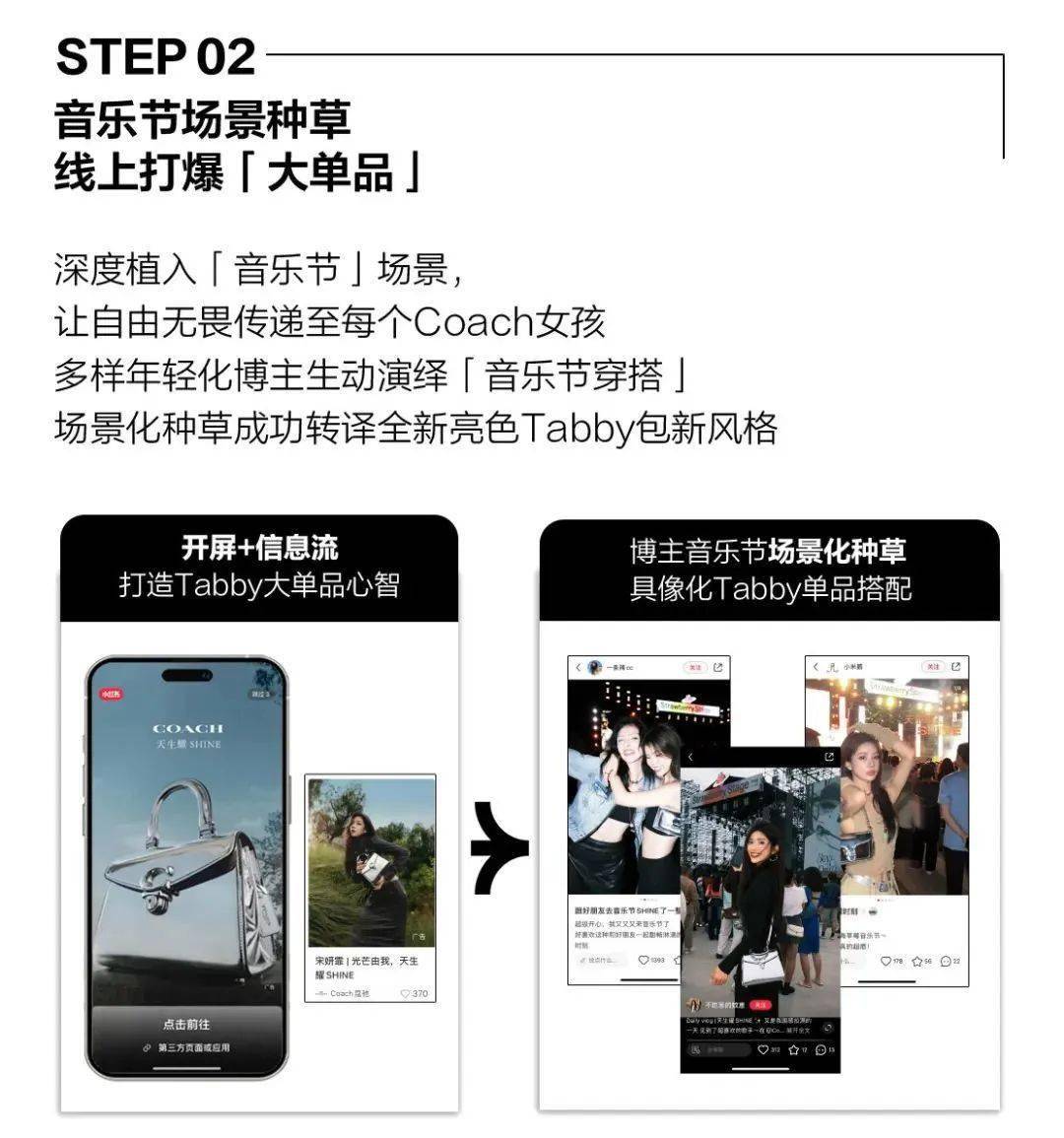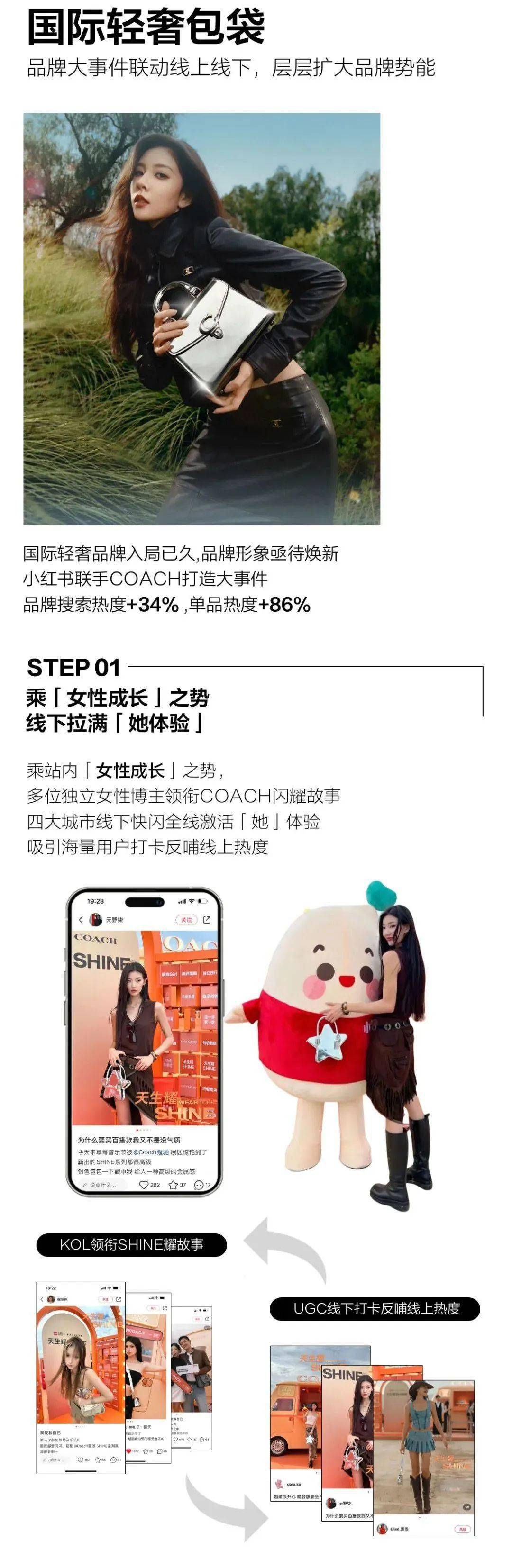 COACH携手小红书打造品牌大事件,层层扩大品牌势能,焕新品牌形象升级。线下快闪全线激活「她」体验,吸引海量用户打卡反哺线上热度;线上深度植入「音乐节」场景,场景化种草打造大单品心智。投放期间,品牌搜索热度增长34%,“Tabby包”单品热度增长86%。