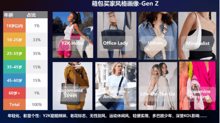 箱包买家整体偏年轻,以Z世代女性为主,同时35岁以下占比69%,同时这类人群也是小红书、抖音等社媒的主流用户,受到KOL带货的影响较大。