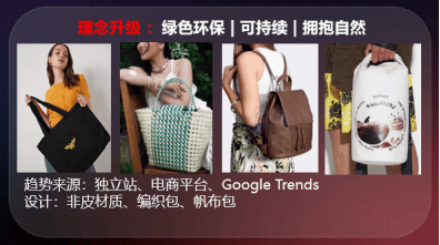 这类产品箱包电商企业可以主打四类比较流行的风格:Y2K千禧辣妹风,老花印花款、中性风运动风、春夏亮色多巴胺风格;同时也可以聚焦在设计师品牌、平替款、特色品牌(例如环保材料等)这几个方向。