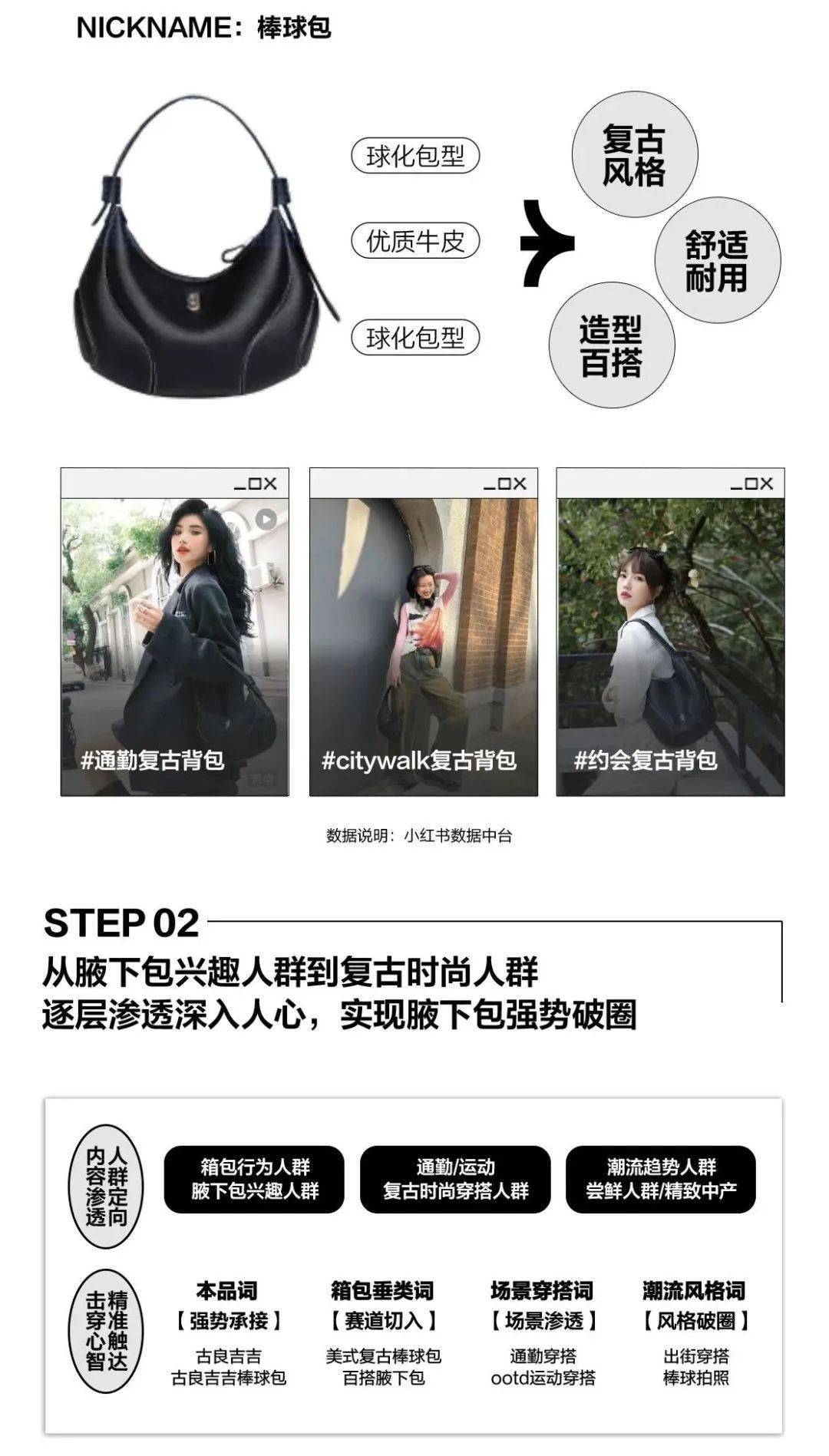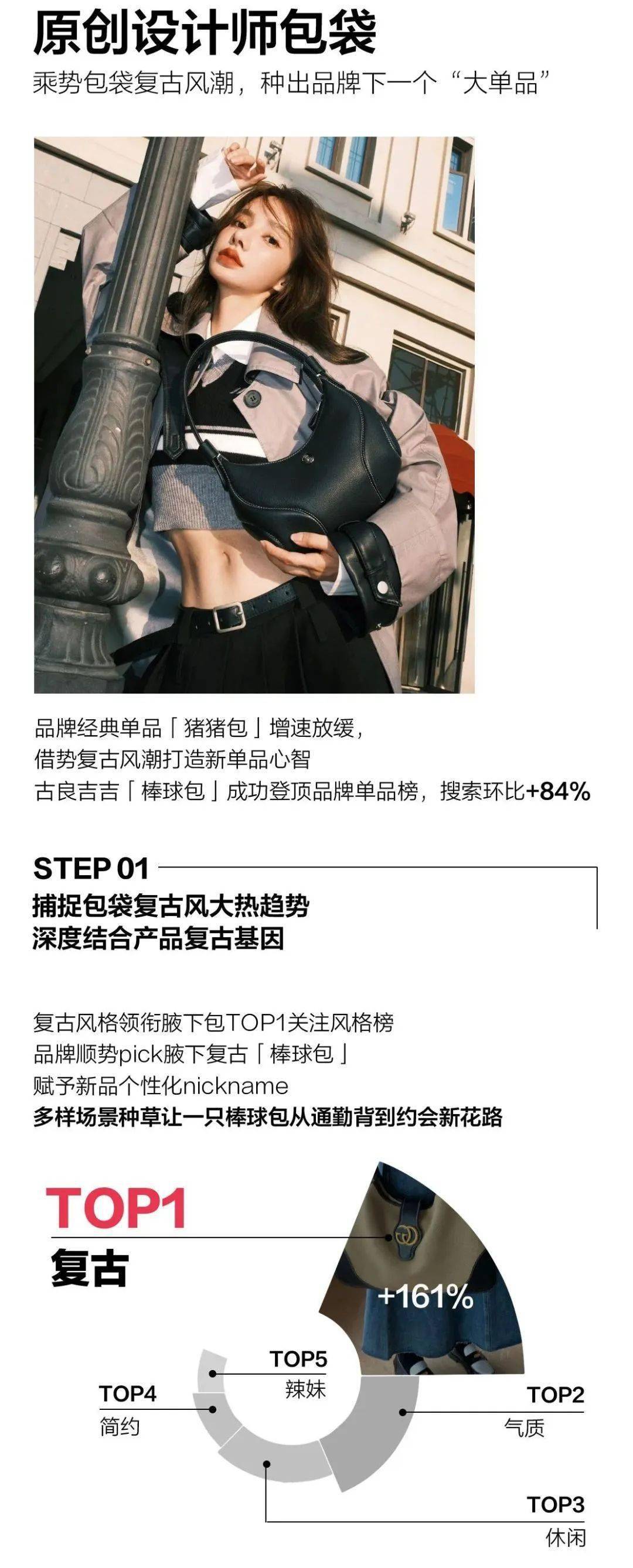 古良吉吉精准捕捉包袋复古大热趋势,结合品牌调性及产品基因,借势打造新心智单品。品牌借助小红书站内复古风潮,多样场景深度结合,成功打造腋下「棒球包」心智单品;通过「人群反漏斗模型」逐层渗透种出品牌新流行,实现棒球包强势破圈。古良吉吉棒球包成功登顶品牌单品榜,搜索环比增加84%。